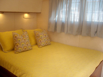 Yacht Obsession has three double queen berths and two bathrooms between these three double cabins. She also has one twin cabin with side by side berths with ensuite bathroom and one queen cabin with additional upper lower twin berths and an ensuite bathroom.