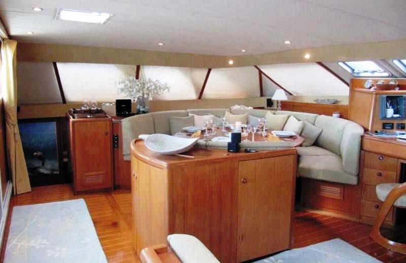 The galley is down so guests have the enjoyment of the whole salon at all times during the charter. The 32 inch TV rotates a full 360 degrees so you can watch it from anywhere in the Salon. The four guest cabins are roomy as well…the aft cabins featuring queen size beds while the forward cabins feature comfortable doubles.
