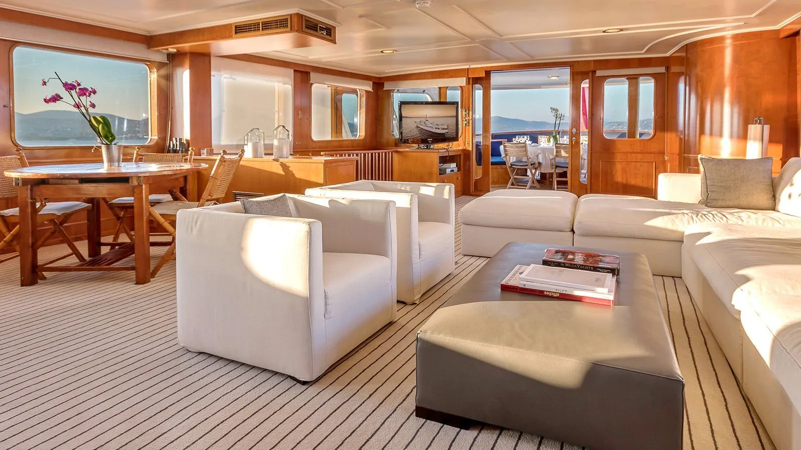 The yacht's VIP double cabin has a 1,60m Queen bed and is located on the main deck forward, which can also transform into a cosy salon. The three twin cabins are located on the lower deck and all cabins are equipped with ensuite facilities, a fridge and LCD TV with DVD and CD player.