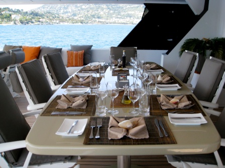 There is plentiful space to sunbathe on the flybridge or enjoy an al fresco cocktail on the aft or upper deck, which provides an ideal area for relaxation and entertainment for private charters or corporate events. Her upper deck has a main table that can fit up to 10 guests for dining and the 2 side tables can seat up to 6 guests each.