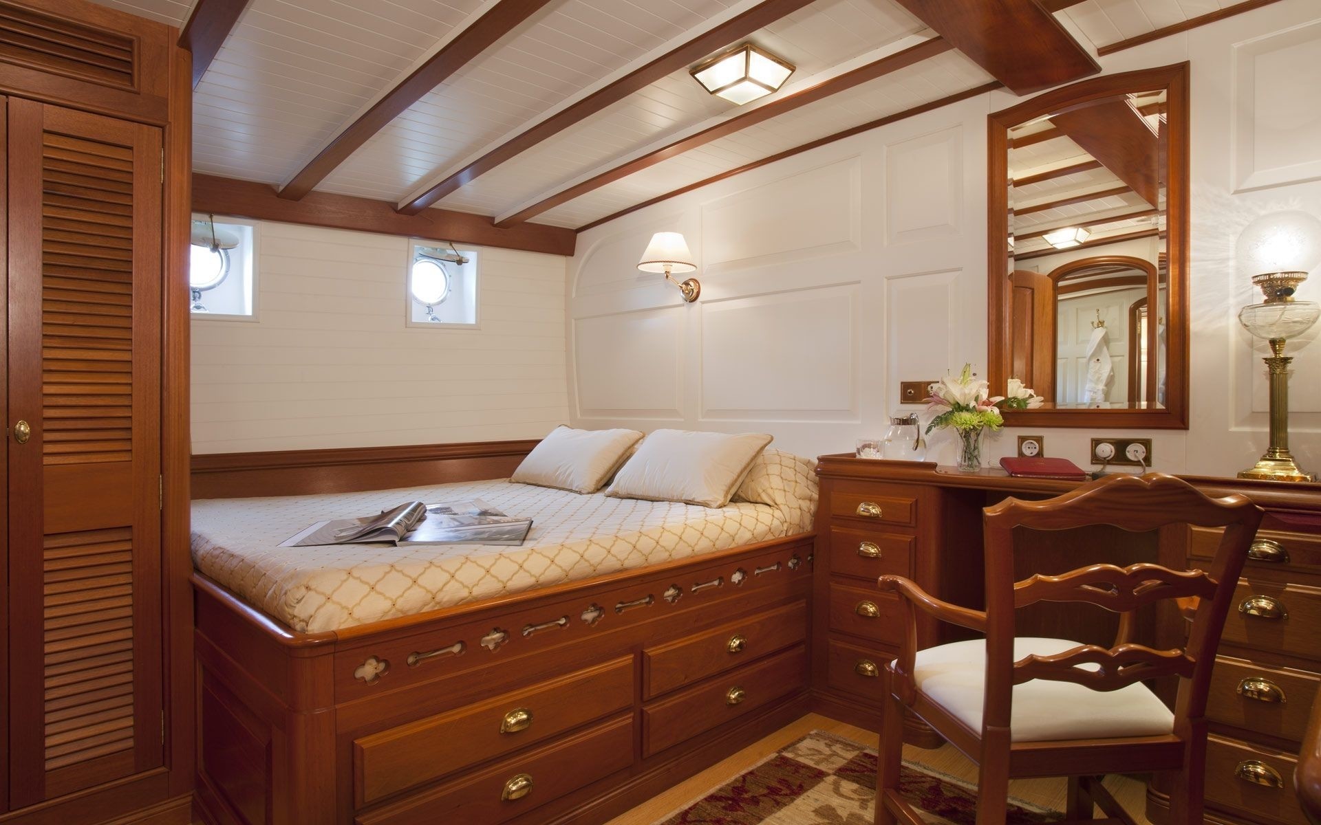 All guest cabins are exquisitely finished with mahogany panelling, while all interior ornamental details follow the original Herreshoff designs. The en-suite bathrooms have separate showers and toilets and are finished with elegant period fittings.