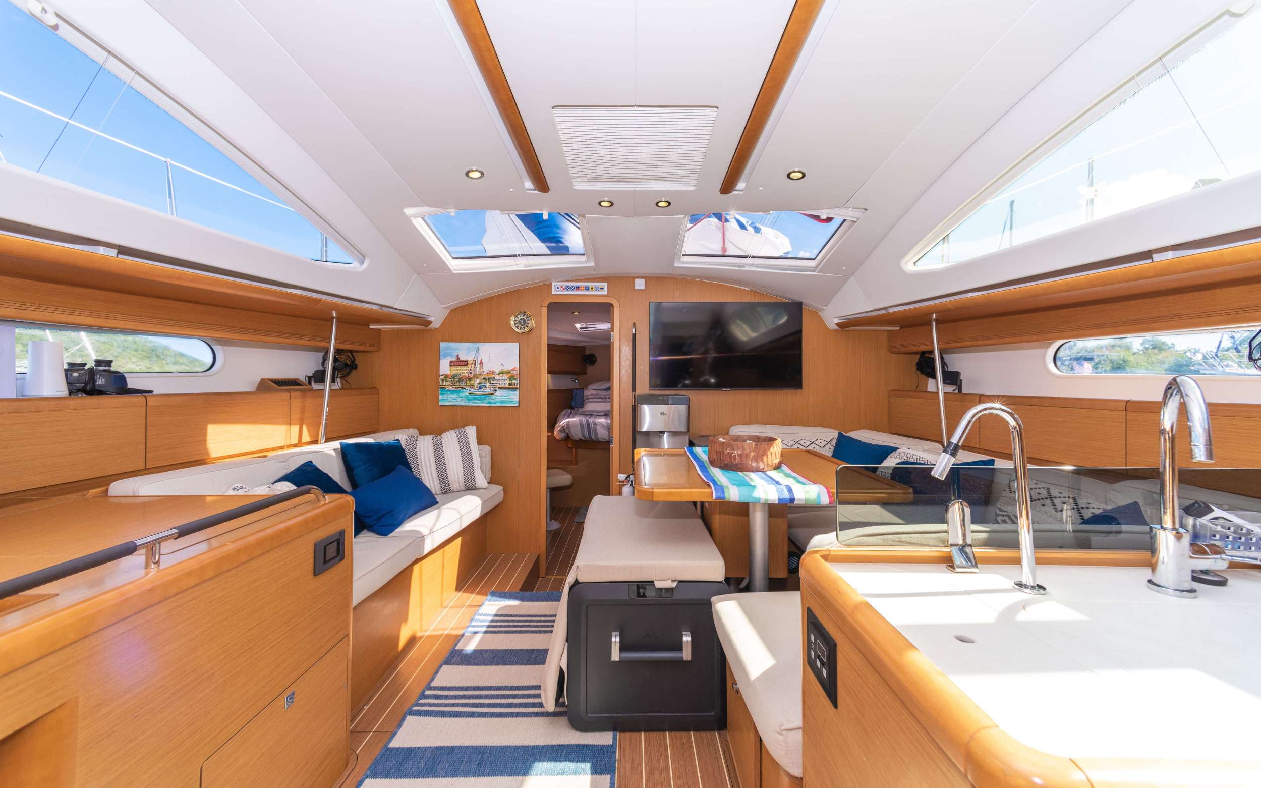 Inside the cosy main salon is a dining banquette and additional sofa seating with an integrated galley. The interior is beautifully presented and light and bright.