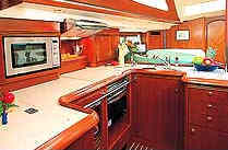 The galley is a seafaring chef's dream with all the conveniences one could ask for - a large refrigerator and outsize freezer, a gas stove, oven, microwave and icemaker. Guests have the option of dining inside or al fresco around the folding dining table on the sun deck.