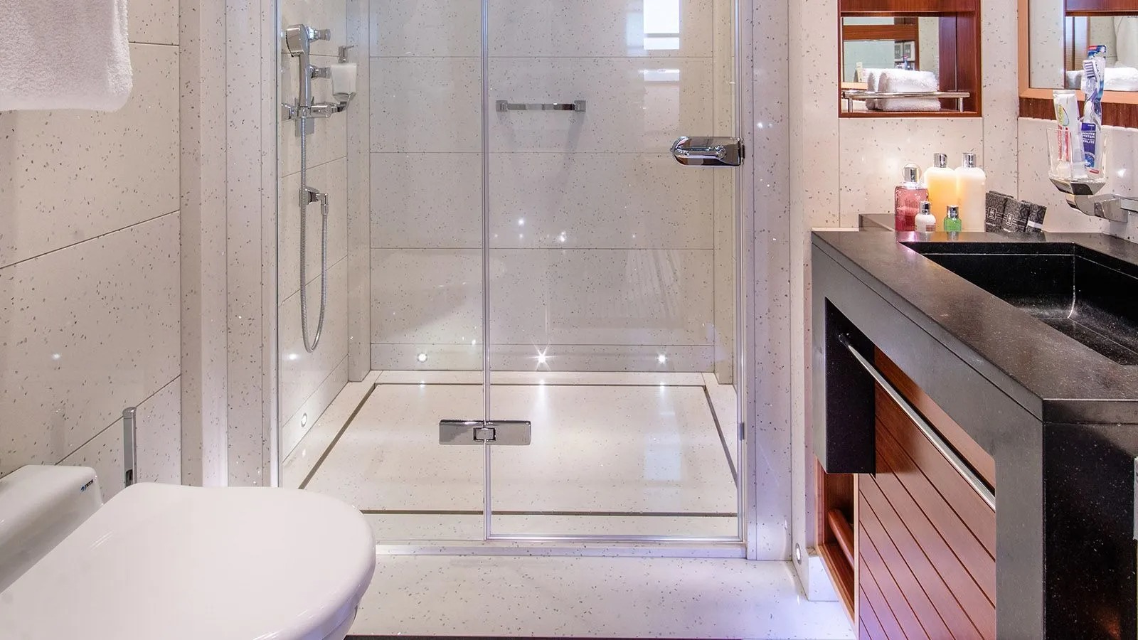 The suite includes a private office and walk-in wardrobes and a large bathroom ensuite. With added flexibility, the VIP cabin is able to be converted if necessary into another general office. Four further guest cabins are situated on RARE FIND’s lower decks.