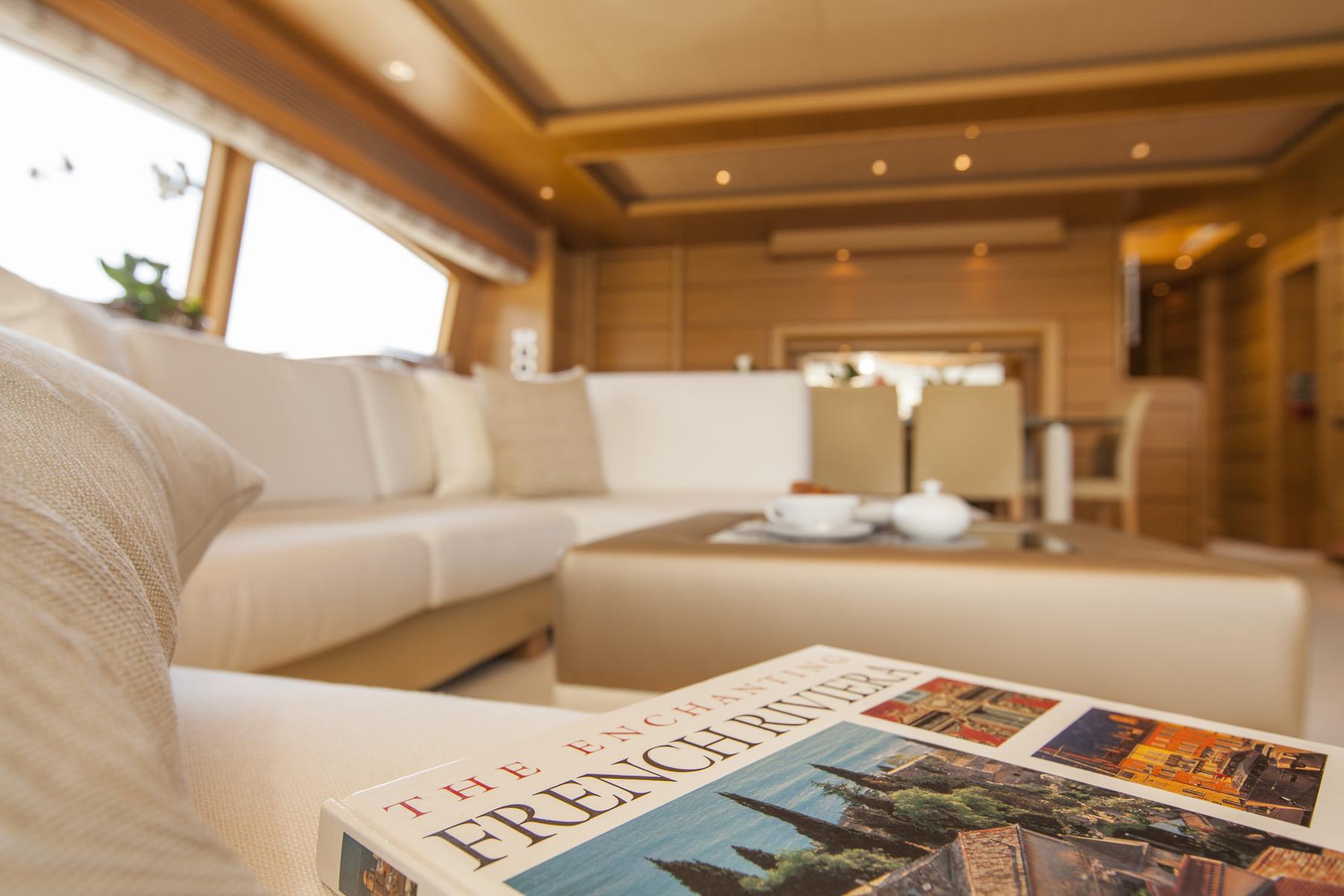 The master has a large ensuite bathroom, a large walk in wardrobe, an audio visual system and a safe. On the lower deck, there are two double cabins and two twin cabins. Each of these is also equipped with a private ensuite bathroom, under floor heating and entertainment systems. On of the double cabins also benefits from a Spa Pool tub.