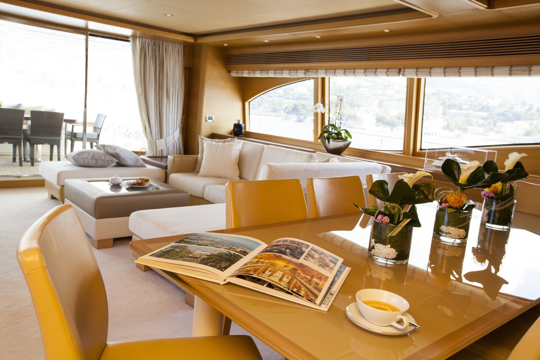 On deck, guests can enjoy alfresco dining on the aft deck or relax and soak up the Mediterranean sunlounges on the flybridge deck. On the water line, the Ferretti Custom Line 97 has a large swimming platform and lazerette where the crew can stow all water toys to keep the decks clear for guest use.