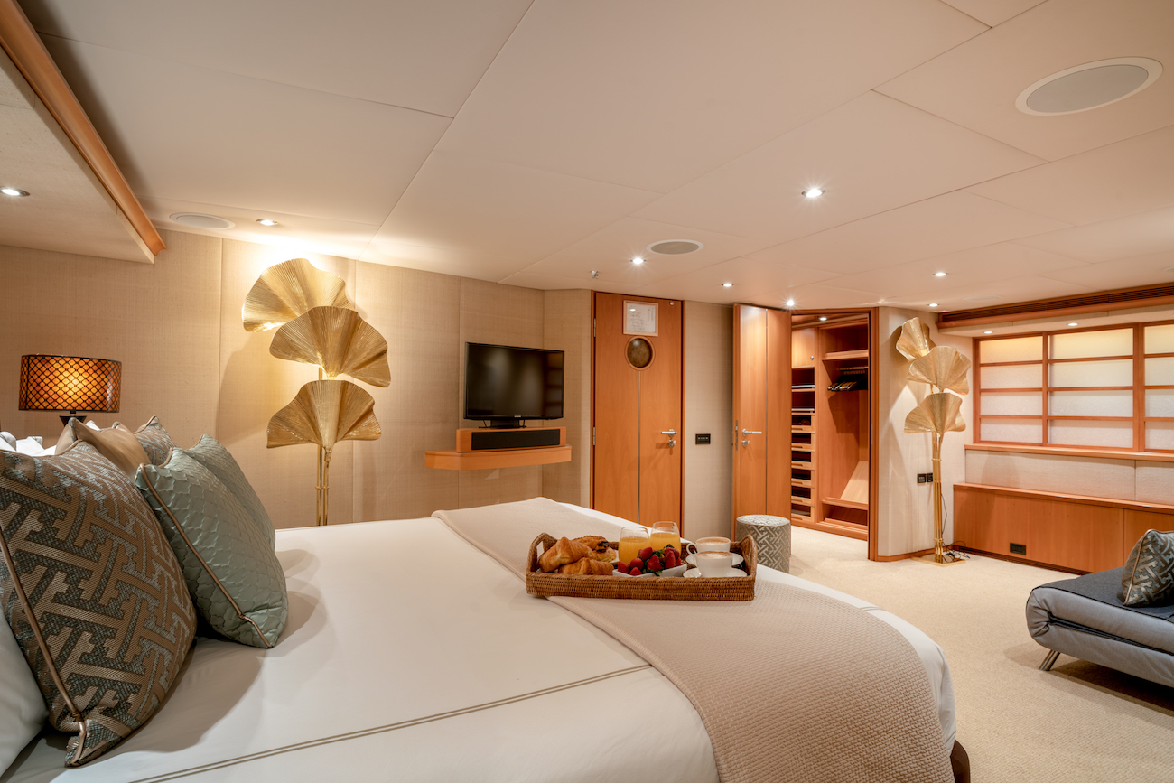 In the main deck forward, there is a Master suite fitted with a deck for work and study, armchairs for private relaxation and an en-suite bathroom.