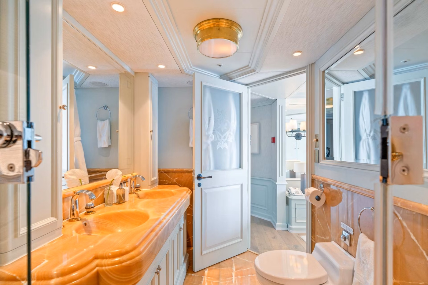 Luxury motor yacht Mosaique features a very large dining table on the upper deck which can easily seat 12 charter guests. She also provides more than ample seating aft for outdoor entertaining. For more formal gatherings, there is a classical dining area forward of the main saloon.