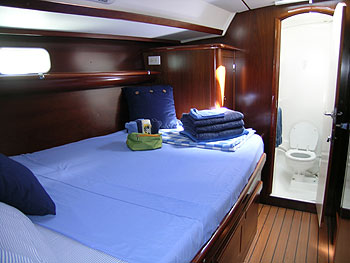 The Bleu Turquoise offers four comfortable guest double cabins, each with its independent head compartment and a separate crew cabin in the forepeak. She takes up to six guests on charter.