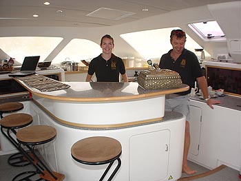 Her saloon is open, spacious and the galley features a serving counter with a bar, perfect for a cocktail while you watch the chef prepare your next gourmet meal. Equipped with an Entertainment system and full time internet ...