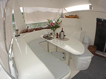 Bliss’s large spacious cockpit has dining tables on both sides and a permanent hardtop bimini over head to protect you from the sun.