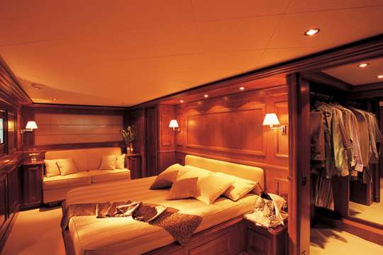The full-width VIP cabin is the only cabin on the main deck, giving total privacy. The en-suite marble bathroom features both a Spa Pool tub and shower. The spacious Master Cabin features a comfortable day couch, dressing tables, a walk-in wardrobe and en-suite facilities including Spa Pool tub.