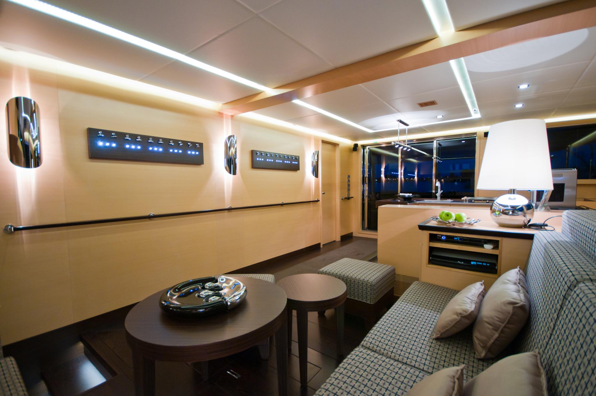 Her expansive shaded cockpit which offers alfresco dining is complemented by her massive flybridge which is also equipped with a dining table and sun loungers. Forward, she offers plenty of room for relaxation and fun on her dual trampolines.