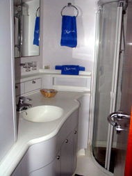 The master cabin comprises one complete hull and features a comfortable queen size bed, large opening hatches, two air conditioning units, sit down computer desk, DVD player, wrap around shelving, enclosed head, separate shower and vanity with wrap around mirrors which all combine to make the Catana 582 such a comfortable charter boat.