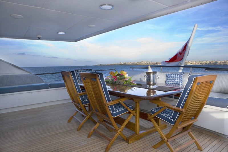 In 2004 the yacht received a new teak aft deck table, new carpeting throughout, her wheelhouse was refurbished in navy blue tones and yachts hull repainted. In 2006 the yacht once again received a new paint, new carpeting throughout and two new Seadoos.