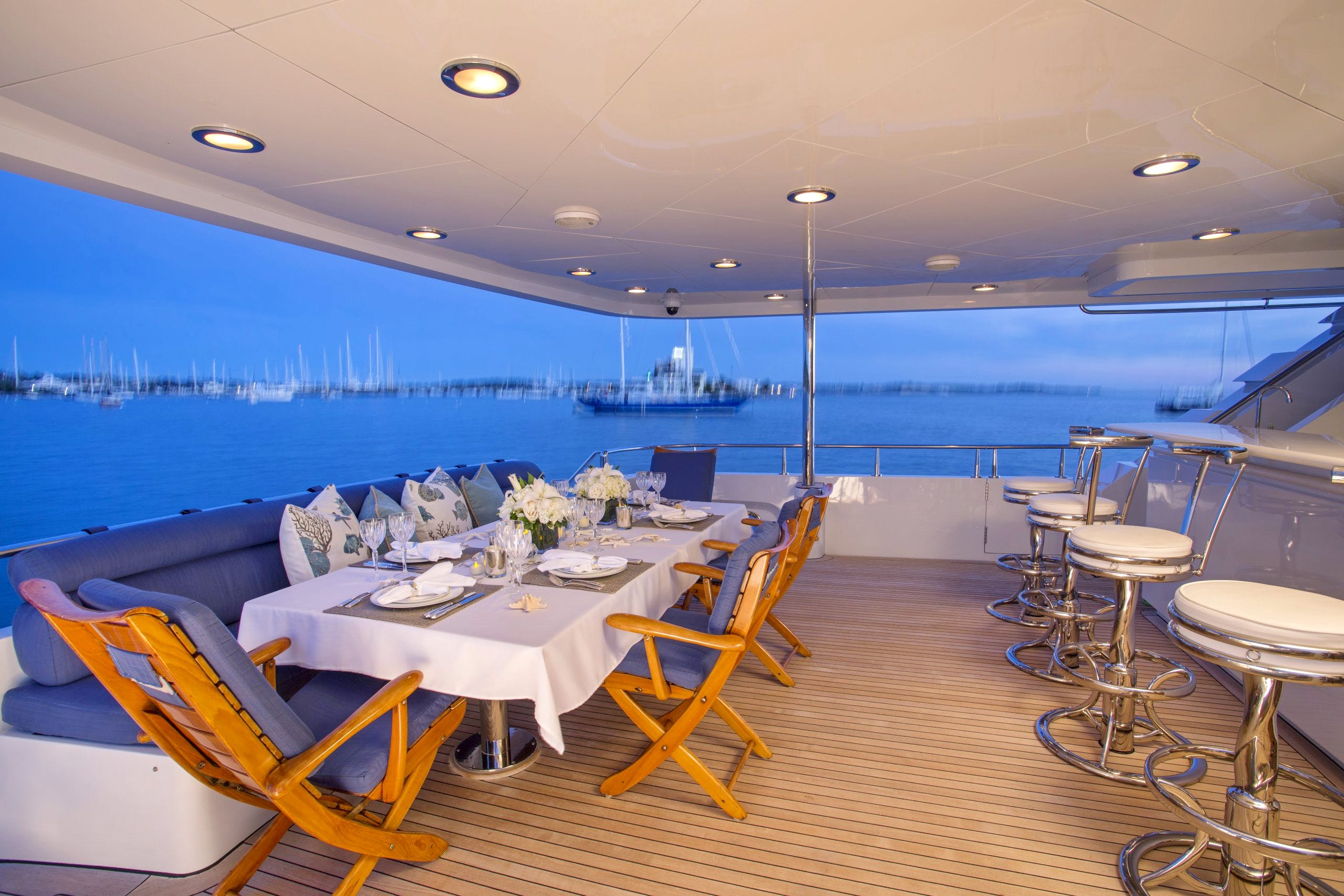The Aft Deck is open but shaded with casual seating for 10, a full bar with bar stool seating for 4 and easy access to swim platform and water toys. Forward of the yacht, there are some additional sun beds.
