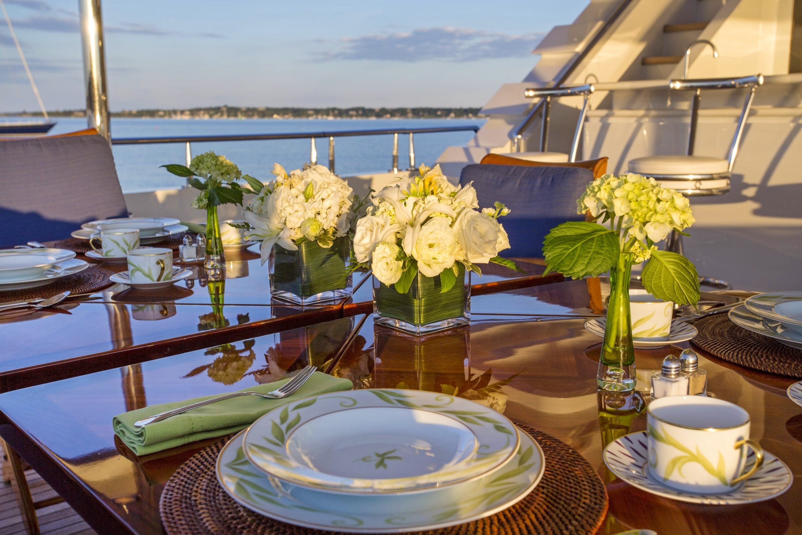 NOTABLE FEATURES for XOXO: Spacious decks ideal for chartering ~ Two alfresco dining options ~ Perfect for socializing with 3 cocktail bars ~ Large salon ~ Private dining room ~ Full beam master stateroom ~ Plenty of water toys ~ Wifi