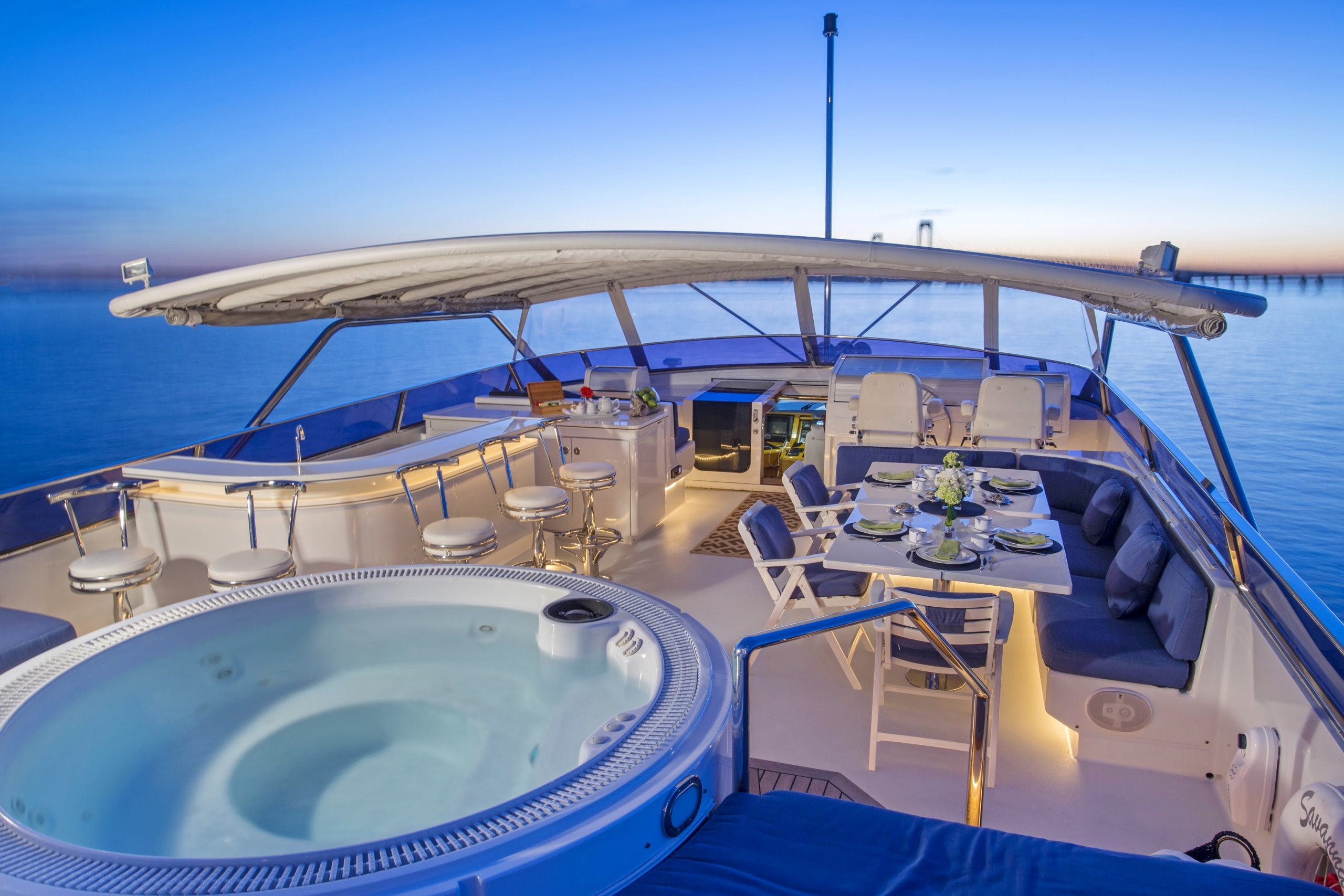 NOTABLE FEATURES for XOXO: Spacious decks ideal for chartering ~ Two alfresco dining options ~ Perfect for socializing with 3 cocktail bars ~ Large salon ~ Private dining room ~ Full beam master stateroom ~ Plenty of water toys ~ Wifi