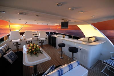 The flybridge is a great place to relax with a bar, barbecue grill, dining table, 3 viewing chairs forward and a sunbathing area. VIAGGIO also has a huge swim platform perfect for relaxing or accessing the various water toys or towed tender.