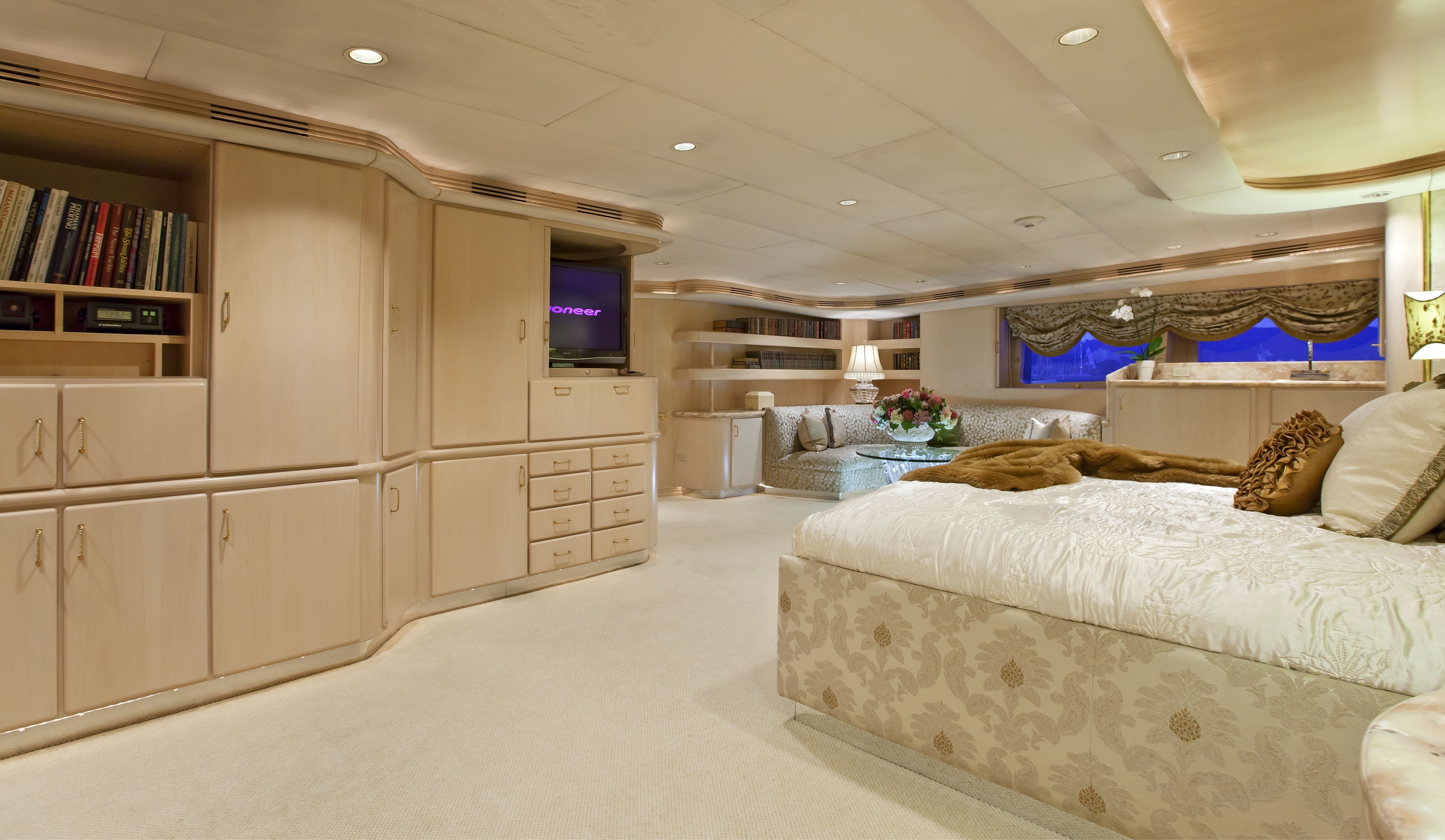 The full-beam master cabin is completely private from the rest of the ship and is generously proportioned with ample storage, a seating area, and a full entertainment system and plenty of natural light from oversized windows.