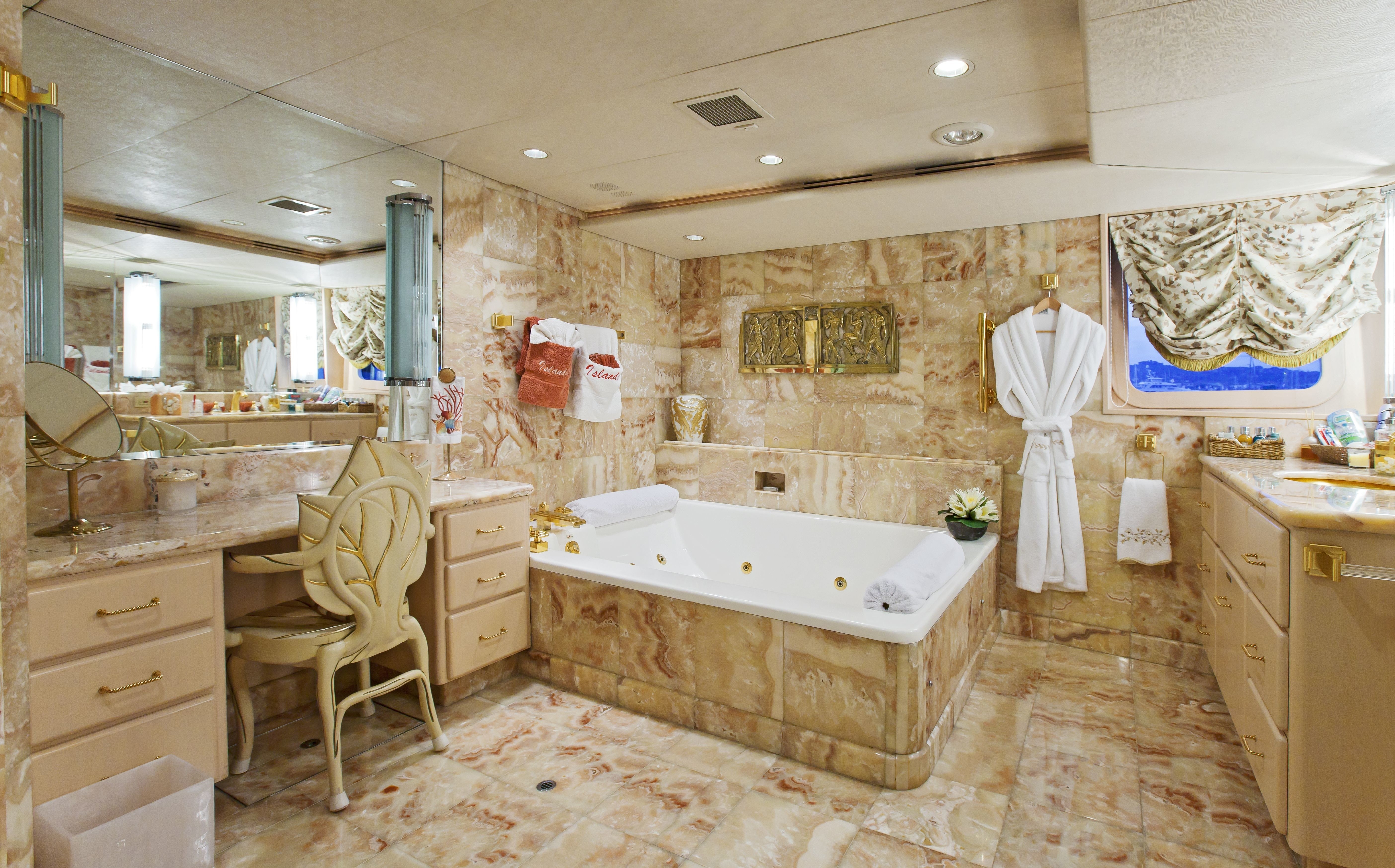 His and her bathrooms are finished in honey-coloured marble, His featuring a large shower and gymnasium equipment that includes a treadmill, weight bench and bicycle. Her bathroom features an oversized whirlpool bath and separate marble shower.