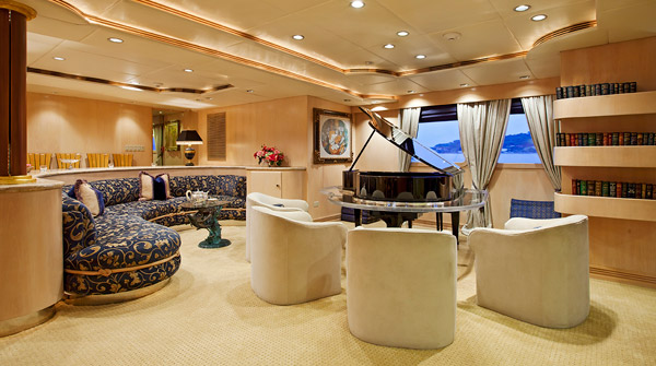 The steps of the staircase are illuminated from within as well as above by a commissioned artwork of stained glass. A full-size elevator services every level her a wheelchair accessible superyacht.