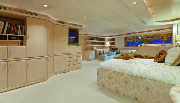 The full-beam master cabin is completely private from the rest of the ship and is generously proportioned with ample storage, a seating area, and a full entertainment system and plenty of natural light from oversized windows.