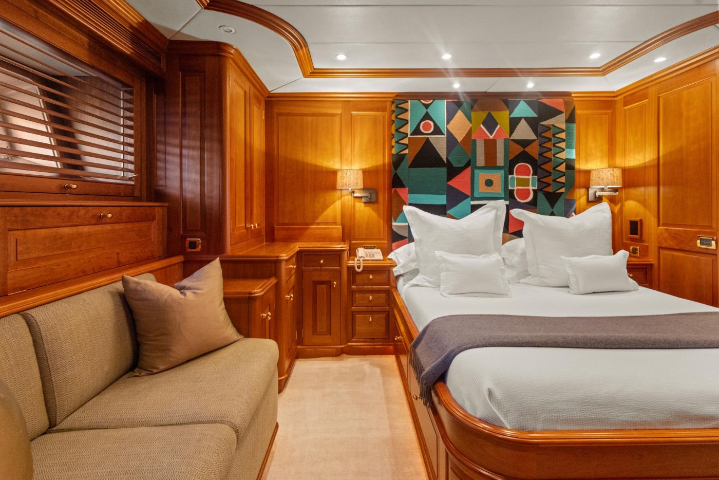 DRUMBEAT's sophisticated accommodation welcomes up to 10 charter guests across five elegantly appointed staterooms, each bathed in abundant natural light. The sumptuous owner's suite, three spacious double guest cabins, and a twin cabin featuring an additional Pullman berth ensure exceptional comfort and privacy for every guest.