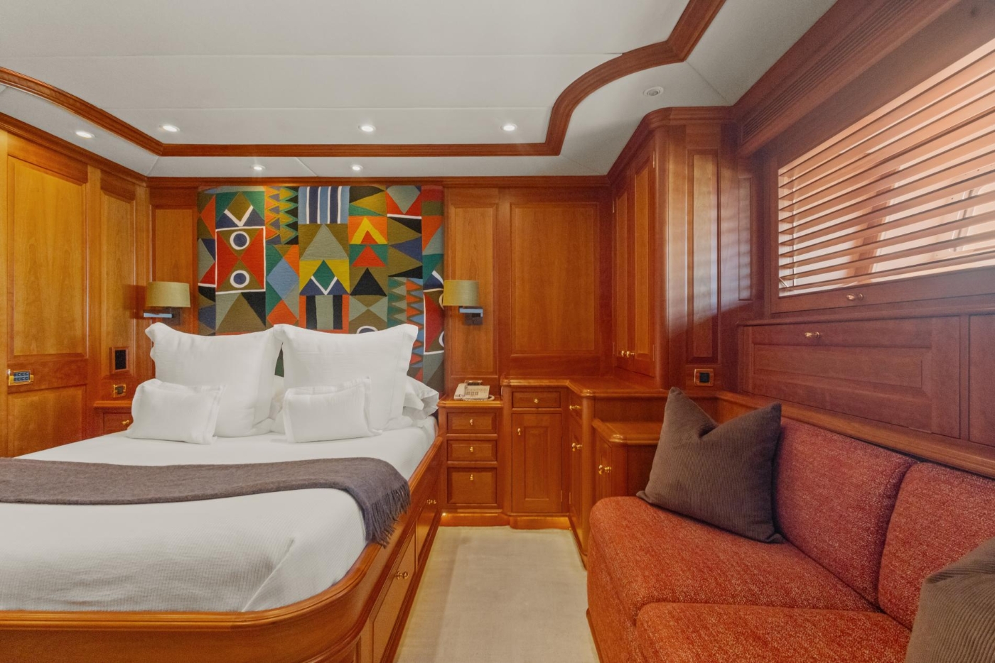 DRUMBEAT's sophisticated accommodation welcomes up to 10 charter guests across five elegantly appointed staterooms, each bathed in abundant natural light. The sumptuous owner's suite, three spacious double guest cabins, and a twin cabin featuring an additional Pullman berth ensure exceptional comfort and privacy for every guest.
