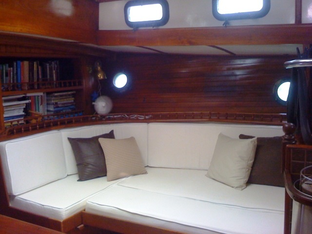 Our Bow double bedroom is a V shaped room that can be arrange for two singles or converted in one double room. There is a center hatch to open for ocean breeze, side windows and fans.