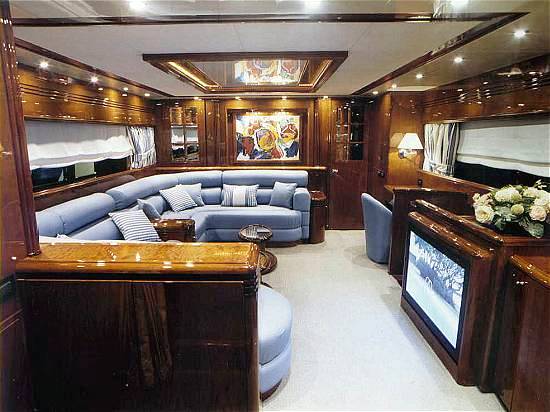 Her aft deck which has a table for el fresco dinning leads into the main salon through double doors. The main salon is tastefully decorated with beautiful wood, light carpeting and a long and comfortable u shaped couch with blue upholstery. There is a separate formal dining room further forward on this main level.