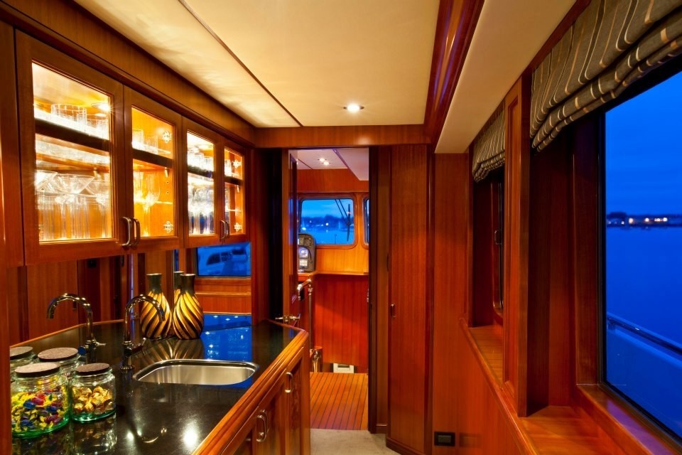 South Coast Marine M/Y VEGA can accommodate up to 8 guests in 3 Double, 1 Twin, cabins, 2 of which are convertible. Her Master suite is on the main Deck and spans the full beam of the yacht. This cabin has separate his and her bathrooms. His with a shower, hers with a steam shower, each with their own head and basin.