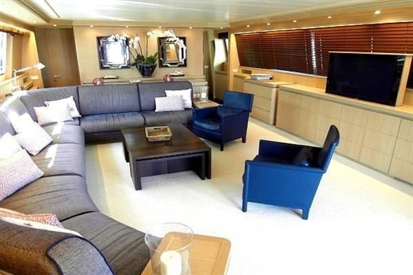 The main salon features a fabulous L-shaped sofa, splendid oak lining the walls of the room and fine materials. This area is the centre of onboard social life. The dining room, with marble table, can comfortably host 8 diners and is serviced by an automatic glass door leading to the Galley.