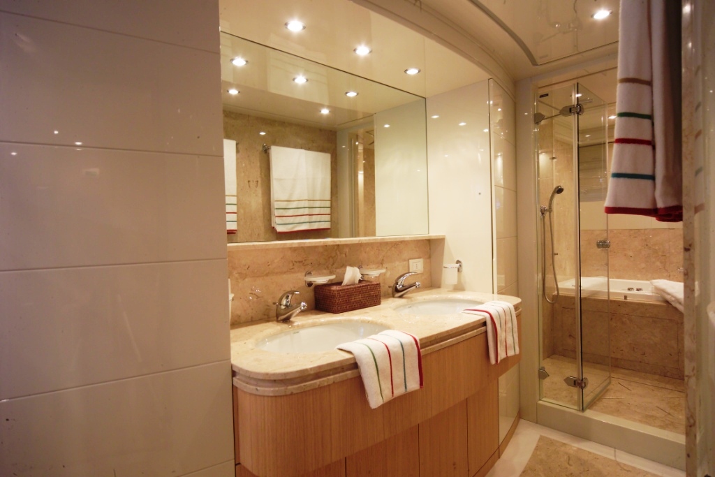 She can cruise with 10 guests onboard. The yachts owner’s suite is dominated by a spacious and comfortable king size bed with sand-colour tones, a handily walk-in closet and an ensuite with 2 entries and both a shower and bathtub.