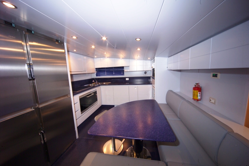 The dining room, with marble table, can comfortably host 8 diners and is serviced by an automatic glass door leading to the Galley.