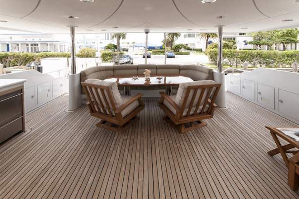 The Aft Deck offers seating and a table for dining alfresco. Her swim platform has a shower and custom swim ladder. On the Flybridge deck, there are areas for sunbathing and shaded areas. This area features a full-bar with ...