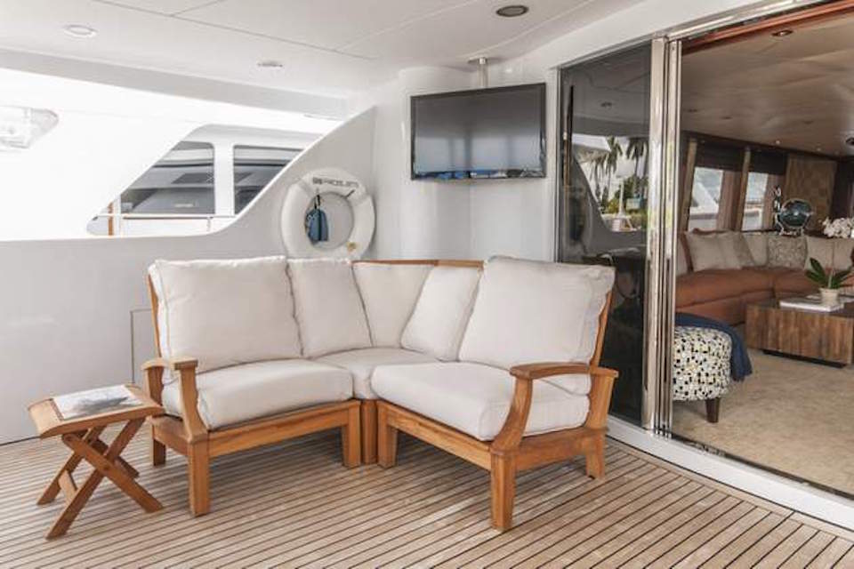 The Aft Deck offers seating and a table for dining alfresco. Her swim platform has a shower and custom swim ladder. On the Flybridge deck, there are areas for sunbathing and shaded areas. This area features a full-bar with ...