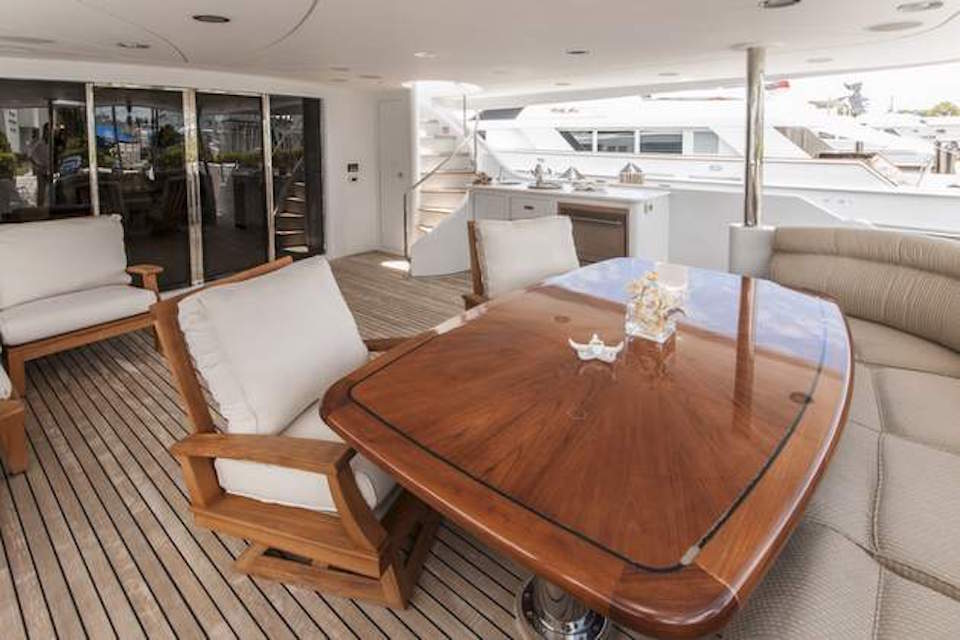 The Aft Deck offers seating and a table for dining alfresco. Her swim platform has a shower and custom swim ladder. On the Flybridge deck, there are areas for sunbathing and shaded areas. This area features a full-bar with ...