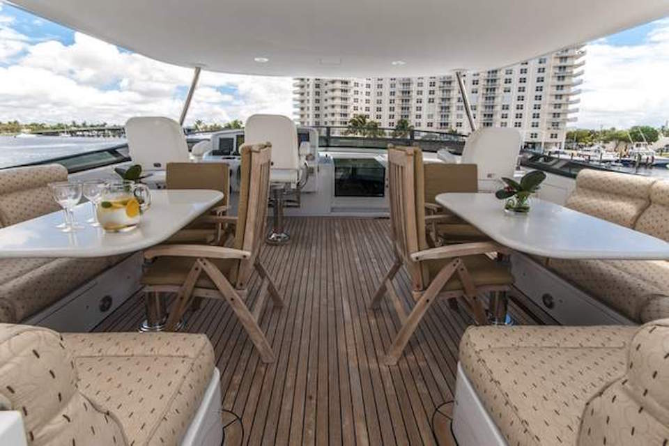 On the Flybridge deck, there are areas for sunbathing and shaded areas. This area features a full-bar with refrigerator and icemaker, three helm chairs, sunpads, BBQ and Spa Pool.