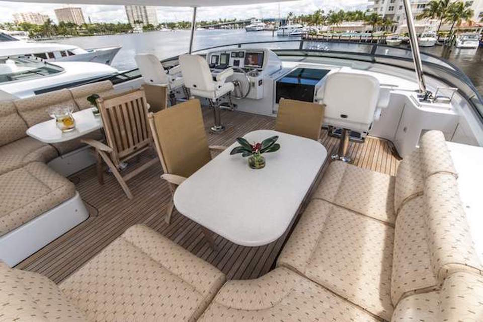 On the Flybridge deck, there are areas for sunbathing and shaded areas. This area features a full-bar with refrigerator and icemaker, three helm chairs, sunpads, BBQ and Spa Pool.