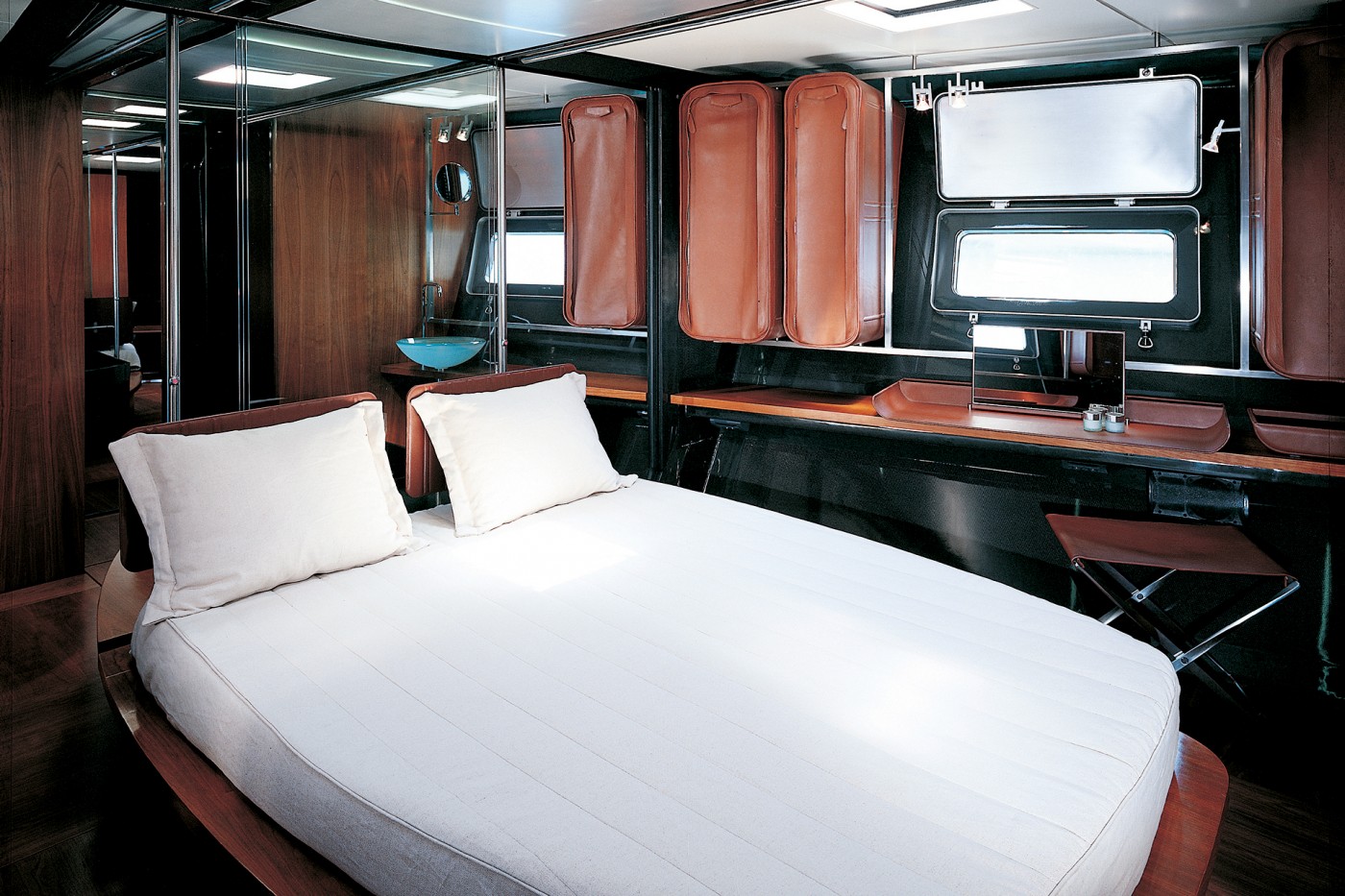 Wally B's owner's cabin features a queen size bed and leather cases mounted on stainless steel frames as cabinets. The owner's bathroom is an integral part of the cabin and is separated from it by an all-glass partition with glass sliding doors.