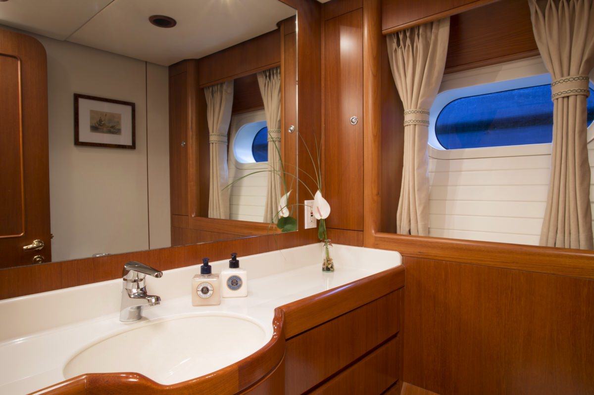 The spacious master suite cabin has a queen size bed, settee, and vanity, ensuite head with shower. The Starboard guest cabin has twin lower single beds which can convert to a queen bed, ensuite head &; shower. The Port guest cabin has fixed twin lower single beds, with ensuite head &; shower.
