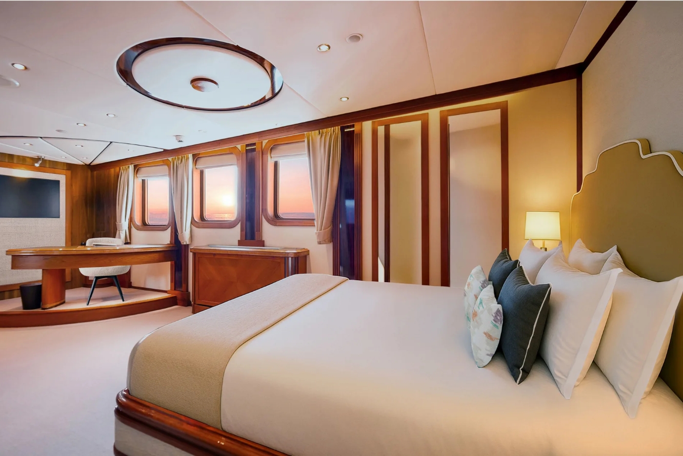 Motor yacht AQUA LARES provides the following comfortable accommodation for up to 30 guests: Her main master stateroom has a king sized bed, a settee sofa, an office, a bar and an en-suite bathroom (with his and hers showers and a Spa Pool tub).