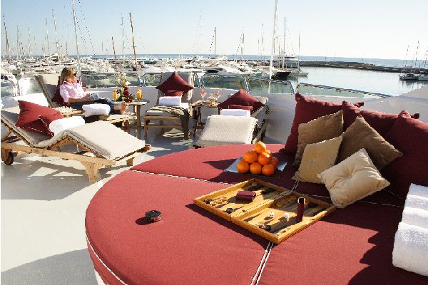 On the upper deck, the aft section makes use of a removable canvas cover for guests to dine alfresco and lounge in the sunshine or shade.