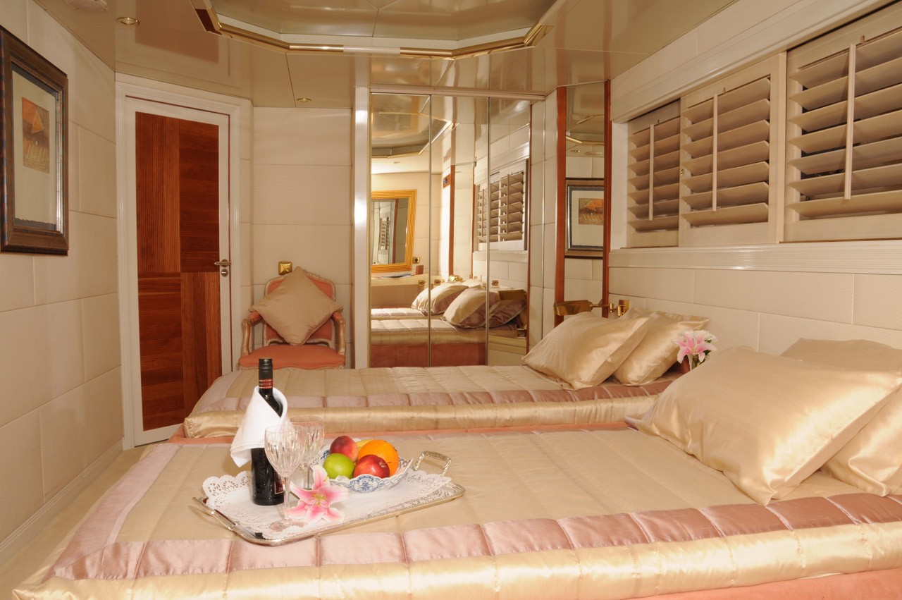 On the lower deck are 4 cabins, each with en-suite bathrooms. The single cabins and additional salon with bar are located on the upper deck.
