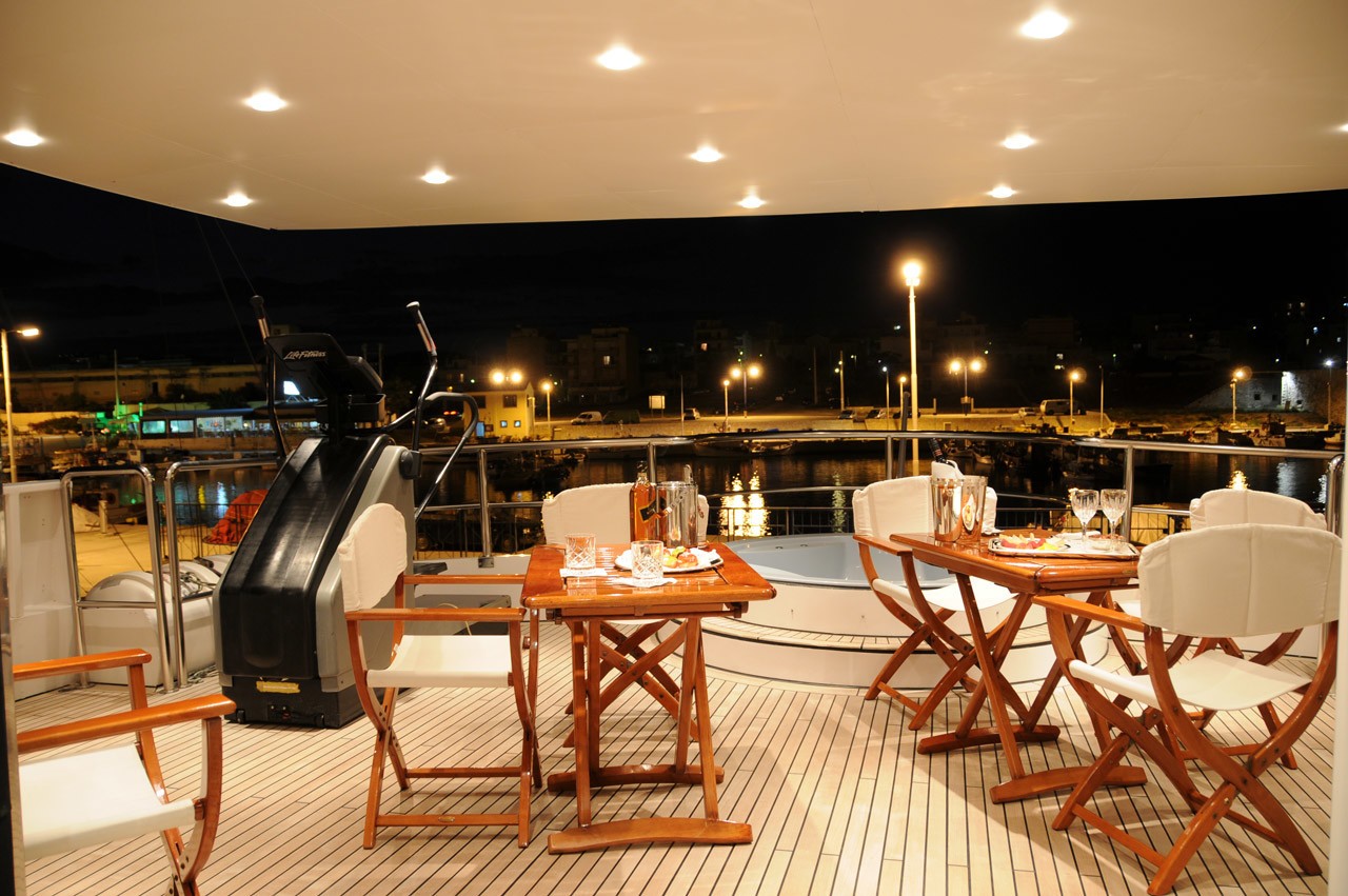 On the main deck forward, with excellent visibility through panoramic picture windows, is the owner's suite, with en-suite marble bathroom, Spa Pool bath and separate rain shower. On the lower deck are 4 cabins, each with en-suite bathrooms. The single cabins and additional salon with bar are located on the upper deck.