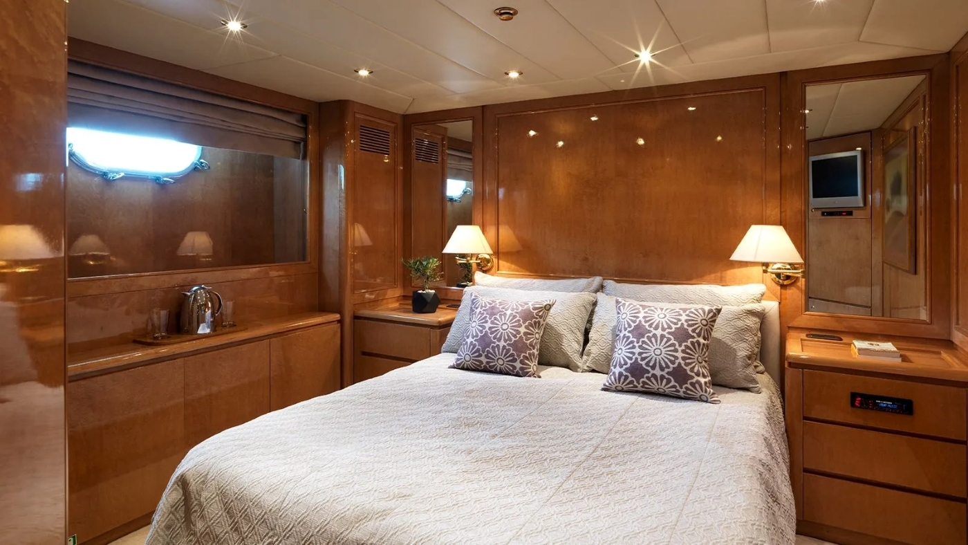 Her lavish master suite spans the full beam of the yacht, while the well-appointed guest cabins and 2 salons create an interior full of elegance and tranquillity. The casual flybridge with on-deck Spa Pool is the perfect place to enjoy the sunset while sipping a glass of wine or cocktail.