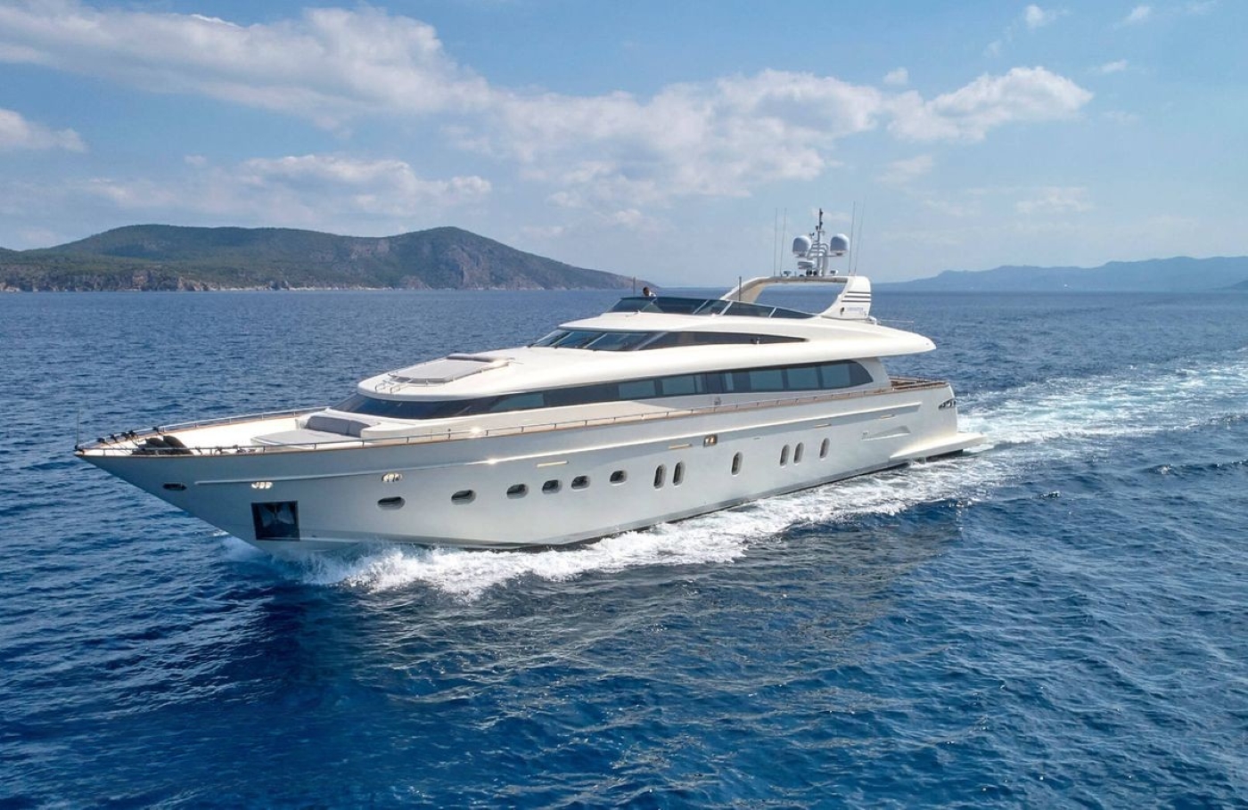 She can comfortably accommodate 12 guests in one master cabin, one VIP cabin, two double cabins and two twin cabins with Pullman berth, all of them equipped with an ensuite bathroom. She has a GRP hull and superstructure and is driven by two MTUs, allowing her to reach speeds between 16-20 knots. She was refitted in 2022.