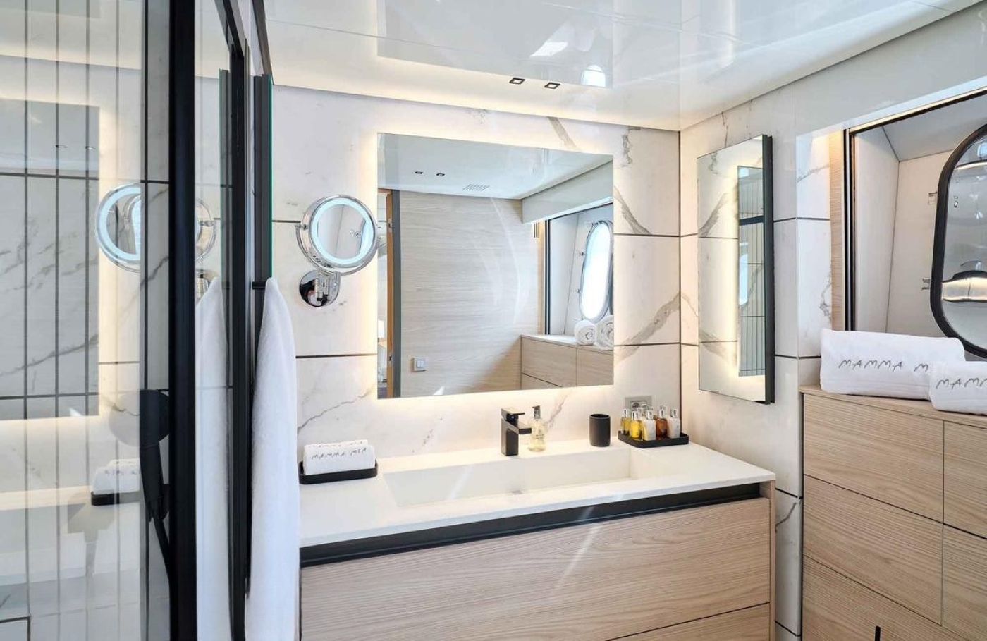 She can comfortably accommodate 12 guests in one master cabin, one VIP cabin, two double cabins and two twin cabins with Pullman berth, all of them equipped with an ensuite bathroom. She has a GRP hull and superstructure and is driven by two MTUs, allowing her to reach speeds between 16-20 knots. She was refitted in 2022.