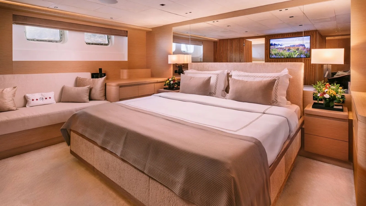 The layout of the salon is very social with couches lining both sides of the salon. The Dining area is elegant yet casual with a comfortable fixed semi circular settee surrounding the table. Her upper salon can be used as a ...